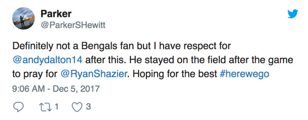 After the game was over, some of the Pittsburgh players knelt to pray for Shazier. They were joined by Cincinnati quarterback Andy Dalton who held hands with the Steelers’ players as they prayed for their fallen teammate.