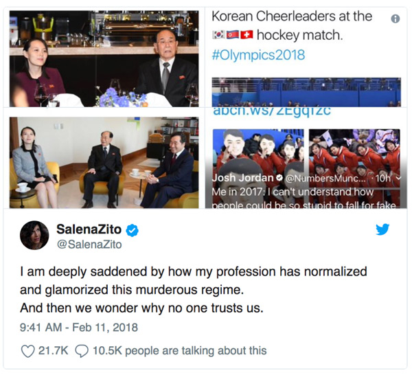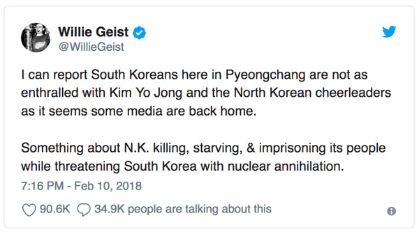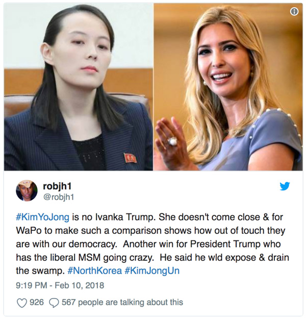 It involves the fawning headlines pouring out around the world over the appearance of Kim Yo Jong, sister of the North Korea’s sadistic communist despot Kim Jong Un, at the Winter Olympics in PyeongChang, South Korea.
