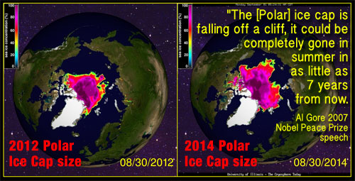 In his 2007, Nobel Peace prize acceptance speech, Al Gore predicted that the arctic would be ice free in seven years, 2014. He was wrong. In fact, a satellite images provided by the University of Illinois Cryosphere project revealed that between 2012 and 2014, the arctic ice bed actually grew: