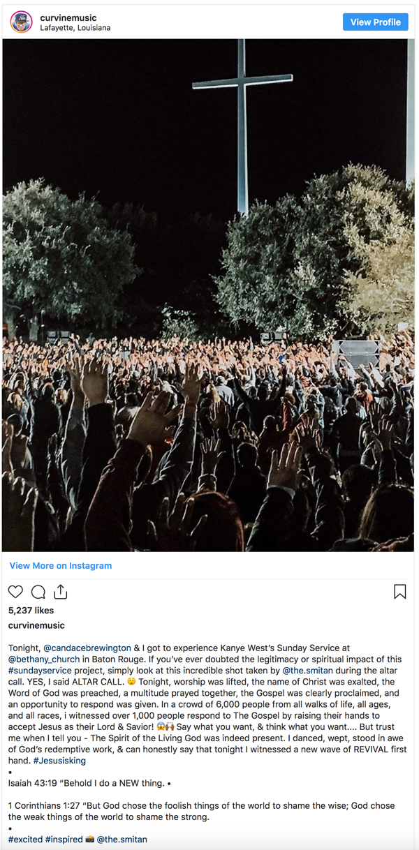 Though many have questioned West’s sincerity, Curvine Brewington, a music leader and pastor from Lafayette, Louisiana described the service on Instagram: