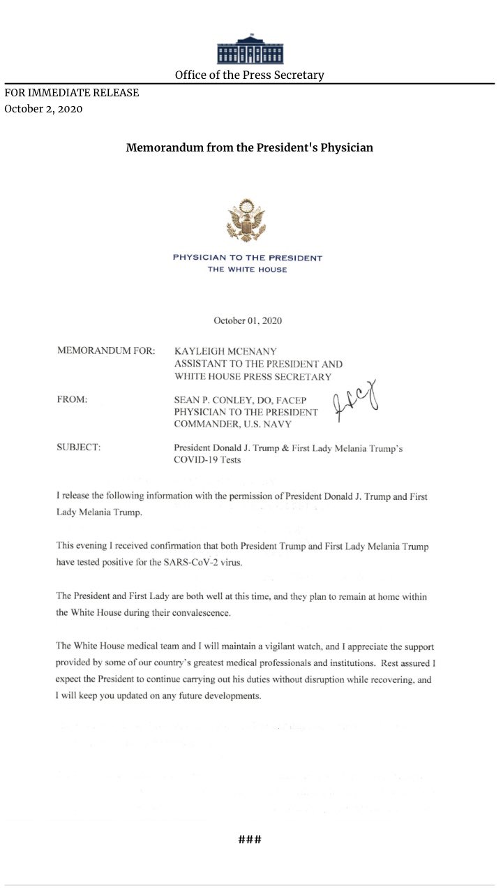 Memo from President Trump’s physician. READ: Memorandum from the President’s Physician