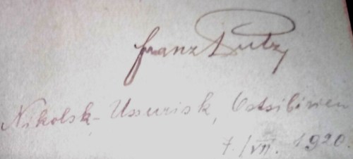 I have a tiny French New Testament, published by the American Bible Society, in 1910, and probably printed in the U.S. It’s in excellent condition, and probably no one ever read it, including me. A few words are penned inside: “French” to tell English speakers that it’s a French Bible, and some faint handwriting “Franz [something] Nikolsk Ussurisk [something] 7/VII 1920. That’s July 7, 1920.