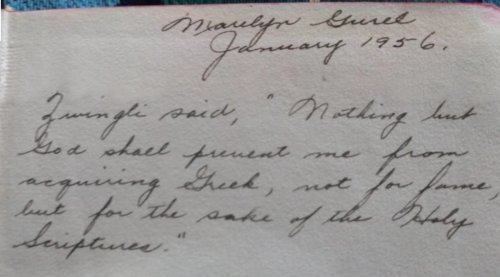 The writing in this one identifies Marilyn Gurel, and January 1956. There is also a quotation from Ulrich Zwingli, a Swiss religious reformer who wanted to learn Greek so he could understand what God was saying.