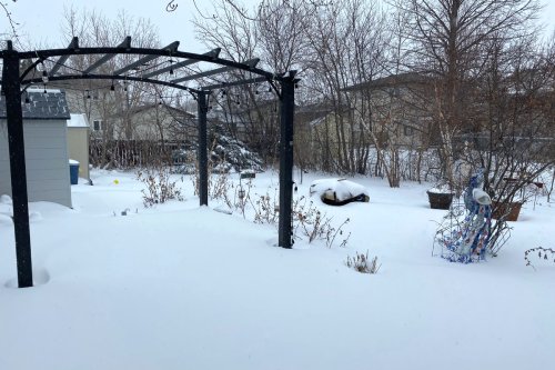 I am getting annoyed by all these fake promises of no snow. It’s April 14, 2022, and below is a photo of our backyard after last night’s snowstorm, that’s continuing today.