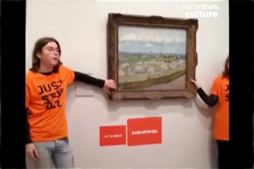 Two eco zealots in Britain, connected with the organization Just Stop Oil, recently superglued themselves to the frame of Van Gogh’s Peach Trees In Blossom hanging in London’s Courtauld Gallery as a protest against global warming.