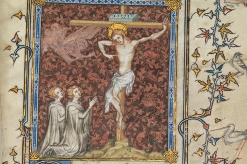 According to Heath, in a painting found in a 14th century Prayer Book, Bonne of Luxembourg, the wound in Jesus’ side, put there by a Roman guard checking to see if Jesus was dead, looked like a woman’s sex organ.