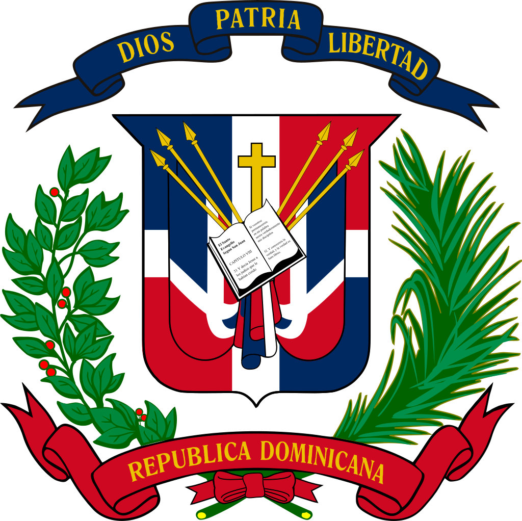 On top of the Coat of Arms is a blue ribbon that reads in English, ‘God, Homeland and Freedom‘, and on the bottom a red ribbon with the name Dominican Republic.